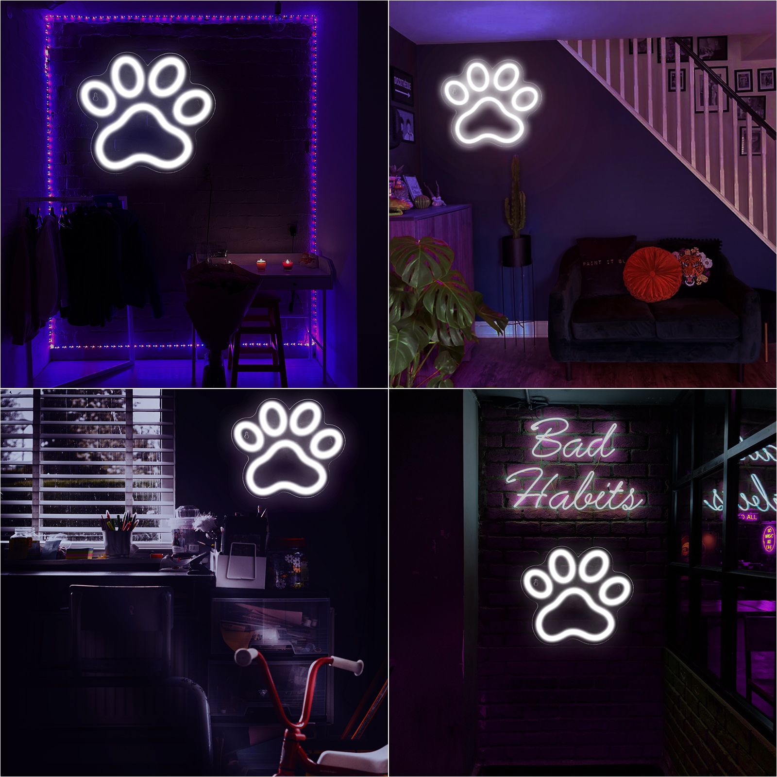 1.Paw print neon sign is suitable for someone or family who like dogs or cats very much that decor their home with love and get the dog/cat a night accompany with the soft lights.