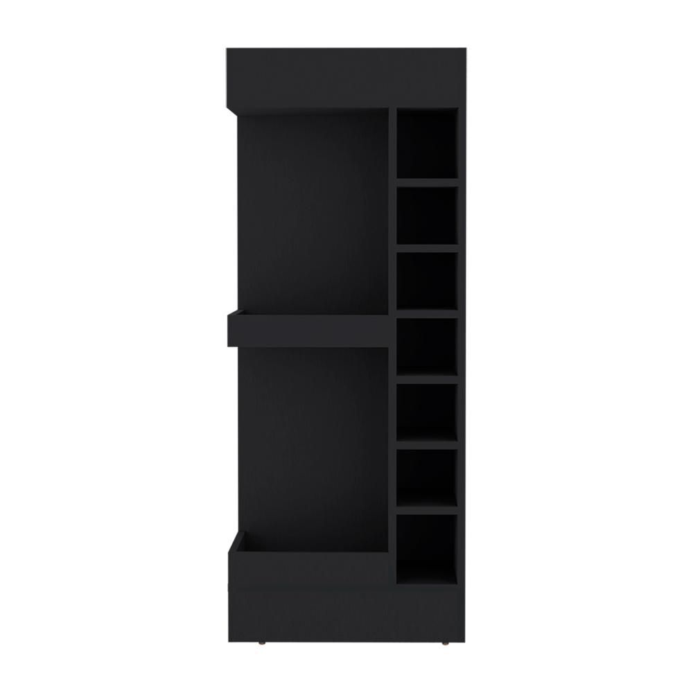 Elevate your living or office space with the Lyman Corner Bar Cabinet. Designed with a black manufactured wood finish, this compact yet versatile bar cabinet fits perfectly into corners, optimizing your space while offering a modern and functional aesthetic. Featuring multiple bottle storage compartments, a spacious middle display shelf, and a sturdy lower compartment, this bar cabinet provides an ideal solution for organizing your wine collection and bar essentials. This stylish cabinet ensures your bar items remain organized, accessible, and elegantly displayed.Dimensions: Height: 45.9'Width: 18.3' Depth: 18.3'